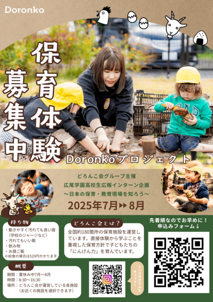 Doronkoプロジェクトとは、全国約180箇所の保育施設を運営するどろんこ会グループと広尾学園高校生が、『日本の保育・教育現場を知ろう』をモットーに企画した保育士職業体験です。