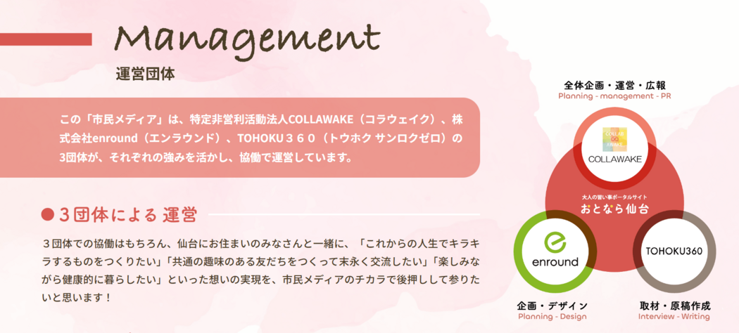 「おとなら仙台」は、NPO法人COLLAWAKE(コラウェイク)、株式会社enround、TOHOKU360(合同会社MEDIAHOLIC)がそれぞれ、「全体設計・運営」、「ポータルサイト制作」、「市民メディア」という専門性を生かして運営するユニークな市民メディアです。