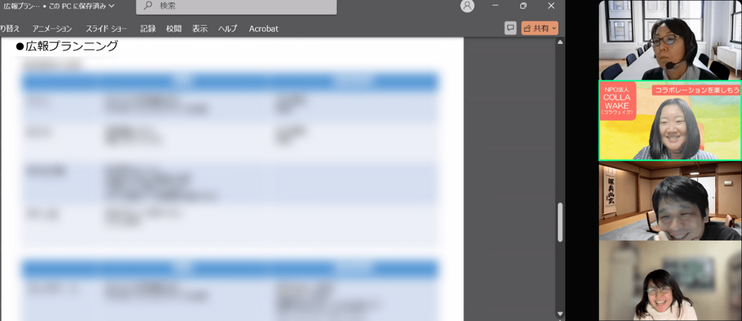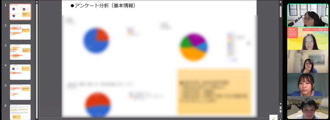 学生から社会人までいて、年齢や性別による分け隔てがなく、いつも和気あいあいとした雰囲気です。目的・目標はメンバー全員で握りつつも、ユーモアや自主性が大切にされる環境です。ミーティングでは、参加者全員に発言の時間があり、集中すべきときは集中する、メリハリのある感じです。代表が大阪人なので、時々ボケや鋭い?ツッコミがあります。
