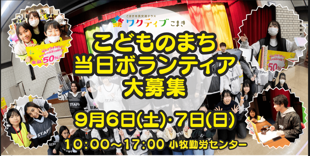 こどもたちが作り上げる「こどもだけのまち」を、小牧市で開催するにあたり、当日の運営を一緒に担っていただけるボランティアさんを募集します!