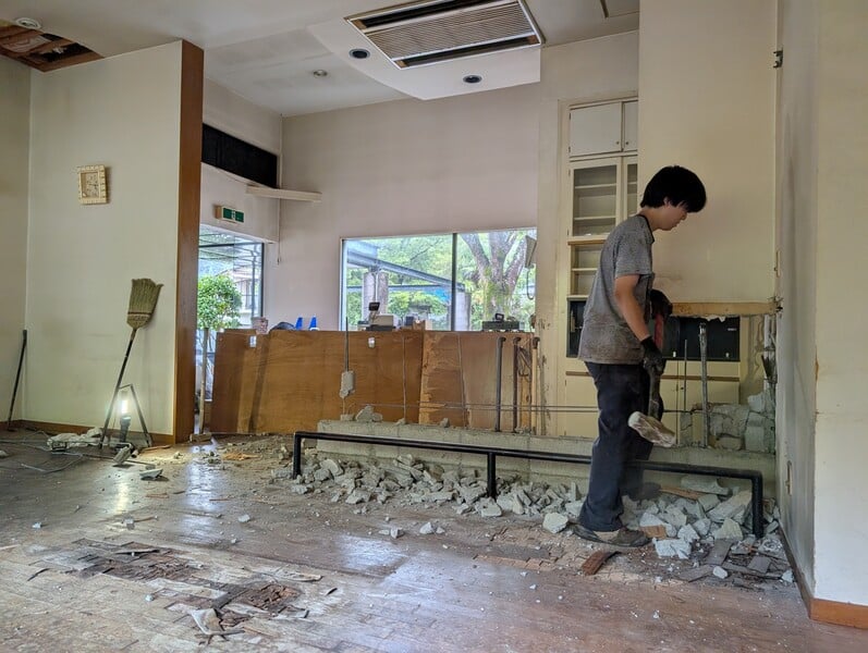 (新規の壁、木工作業(テーブル・カウンター・キッチンなど)、左官、照明、看板づくりなど)