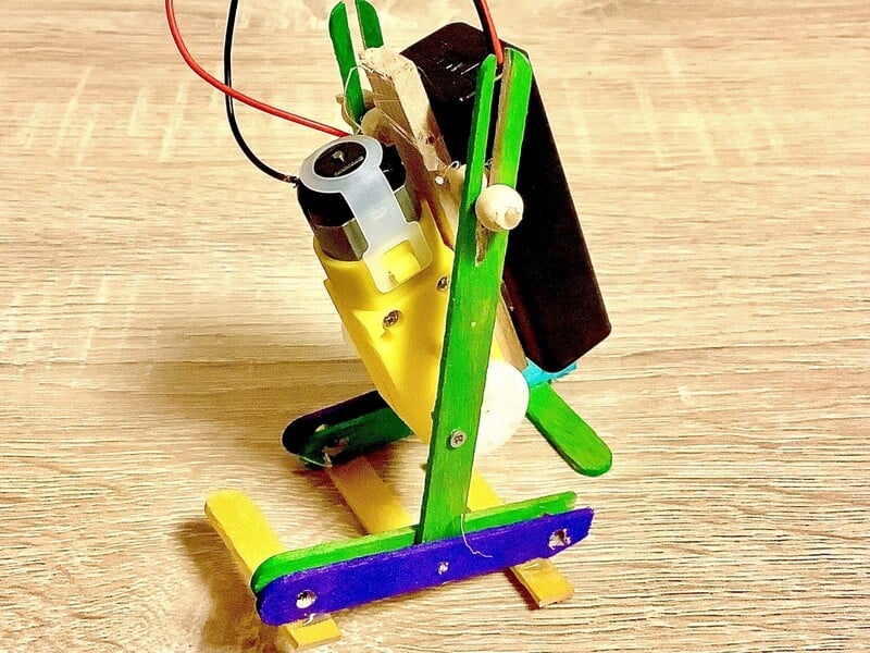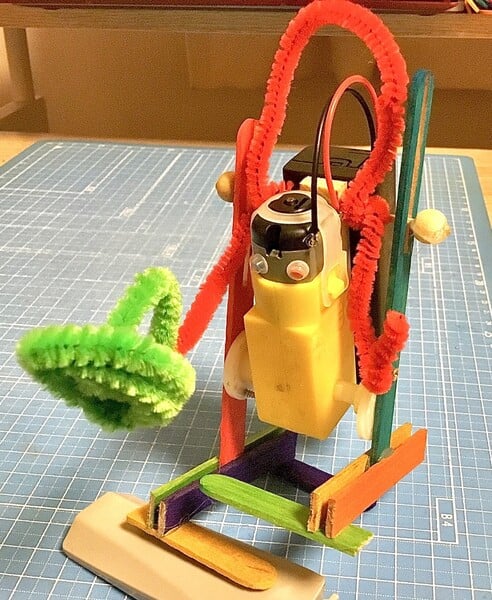 こちらが工作するロボットです。ギアモーターを使い、簡単なカム構成で取り付けた脚を動かして前に進ませる構造になっています。