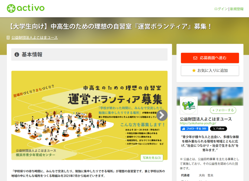 (仕様上URLを貼れないので、activoのフリーワード検索から「よこはまユース」と入力して見つけてください)