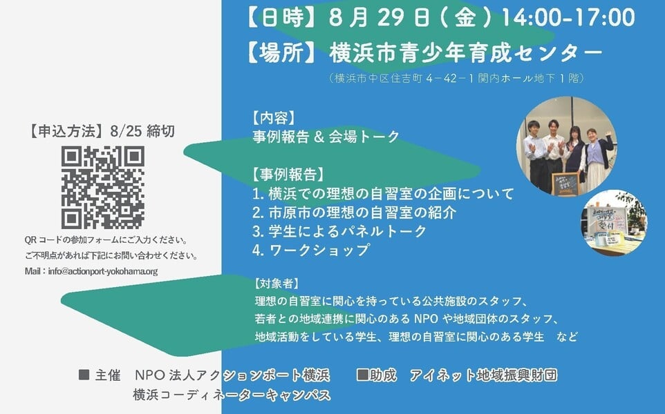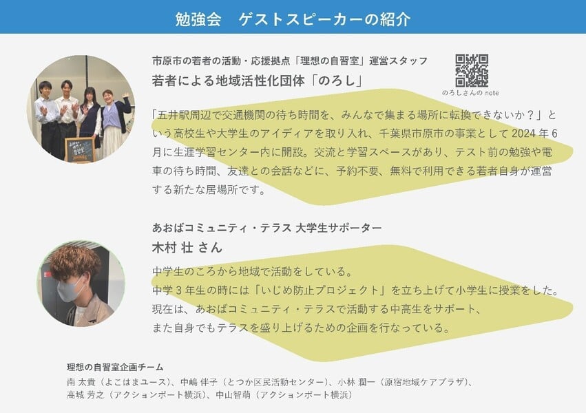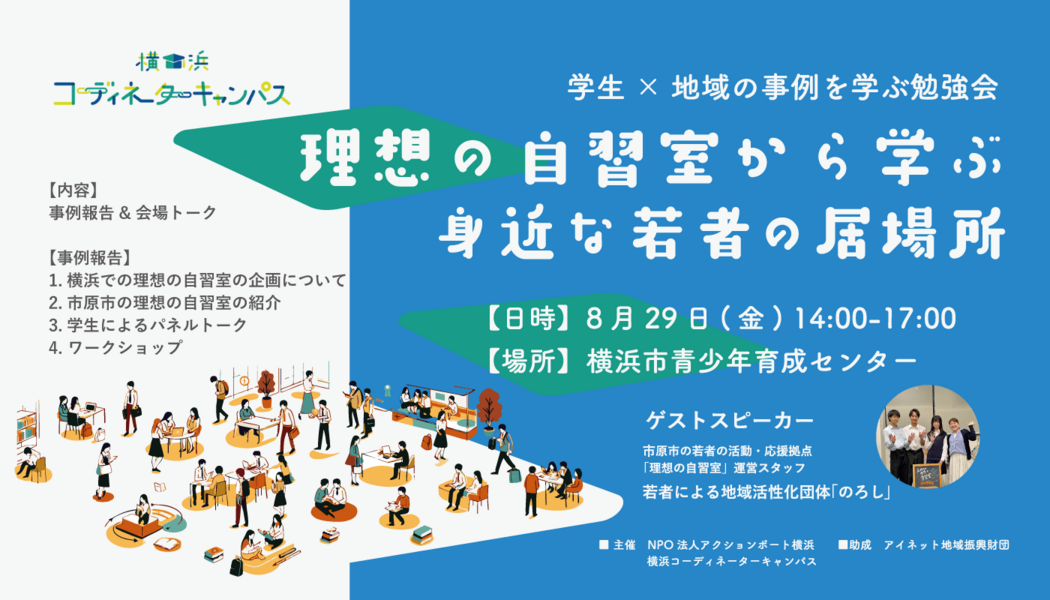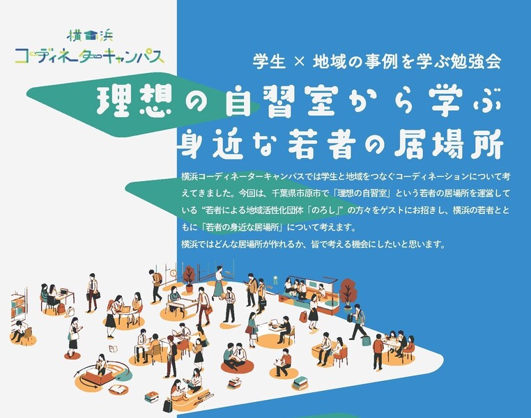 千葉県市原市で「理想の自習室」という若者の居場所を運営している方をお招きし、横浜の若者とともに「若者の身近な居場所」について考えます。横浜ではどんな居場所が作れるか、皆で考える機会にしたいと思います。