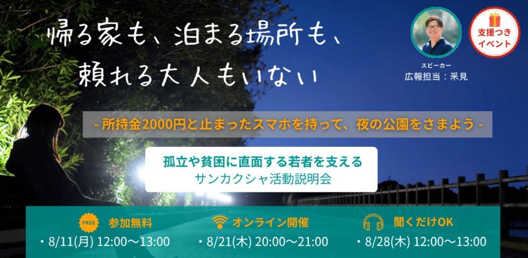 今なら、この活動説明会に参加するだけで、サンカクシャに100円の支援金が届けられます!