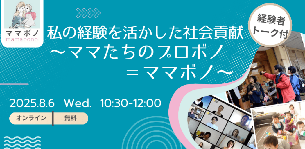 育休中、離職中復職前の期間に、今だからできる活動をしたい、社会貢献をしたいという皆さんに、社会貢献活動の楽しさ、ママボノのご紹介をするオンラインイベントです。(ママボノ参加者募集締切9/5)