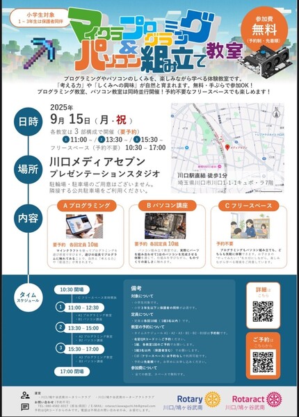 川口市を基盤に活動する青年社会奉仕団体、川口/鳩ケ谷武南ローターアクトクラブによる、市内の教育格差是正を目的としたマイクラプログラミング&パソコン教室です!