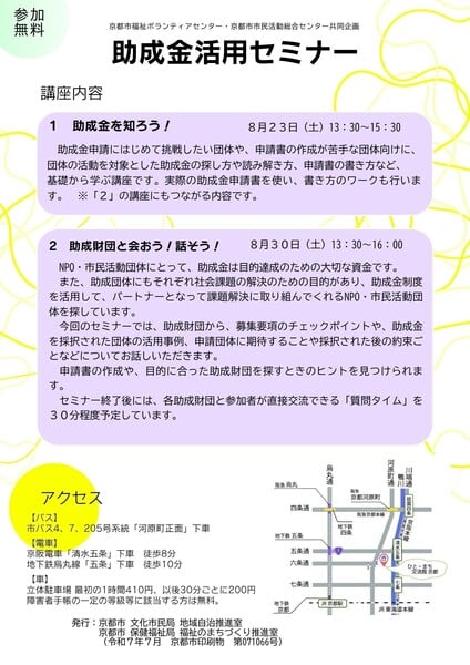 京都市福祉ボランティアセンターと京都市市民活動総合センターが共催するので、ボランティア団体・市民活動団体の資金に関するお悩みを広くカバーできる講座です。