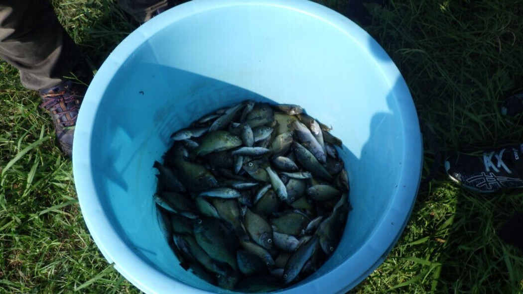 在来魚保護のために琵琶湖にてブラックバス・ブルーギルなど外来魚の駆除を行う