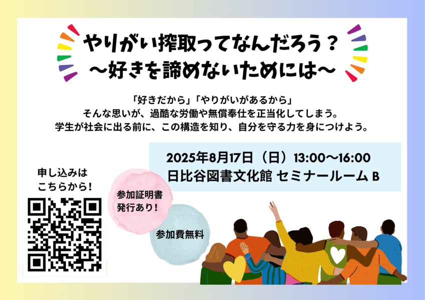 2025年8月17日(日)13:00〜17:00、日比谷図書文化館セミナールームBにて、「やりがい搾取」をテーマにした対話型イベントを開催します。対象は学生で、参加費は無料です。