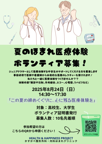 - 8/24(日)春日部ほまれクリニック医療体験ボランティア募集★証明書有