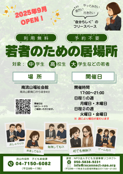 家や学校でも塾でもない「第三の居場所」が不足し、相談先や安心して過ごせる場が見つけにくい現状があります。流山市南部で運営する本事業は、見守りと対話、学習の伴走、ゆるやかな遊びや交流を通じて、若者が安心して過ごし、人とつながり直せる環境を提供します。