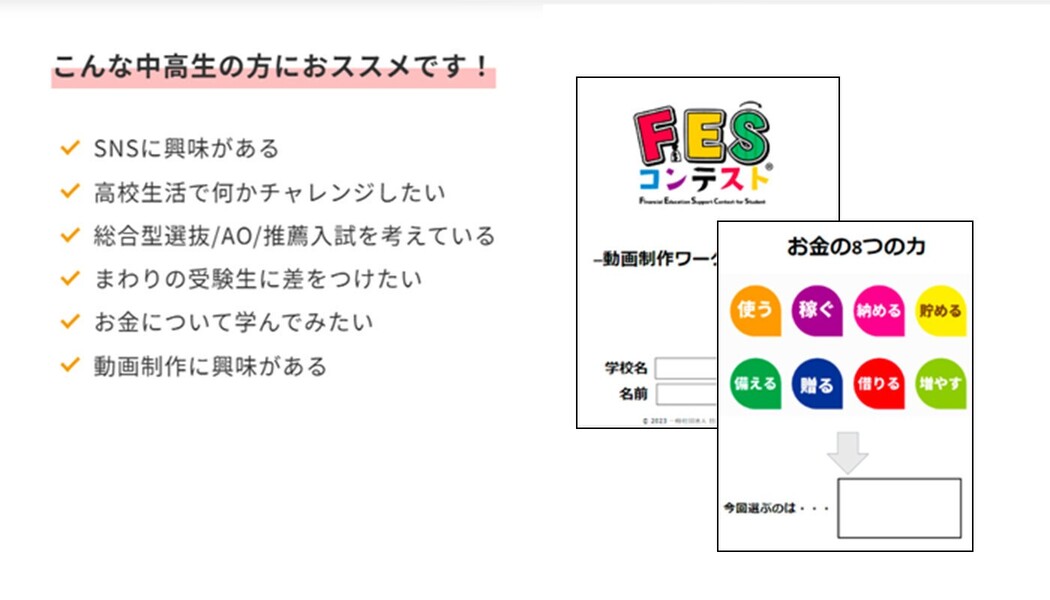 FESコンテスト(Financial Education Support Contest for Student )は、小学生のための金融教育動画を中高生が制作し、そのクオリティを競うコンテストです。