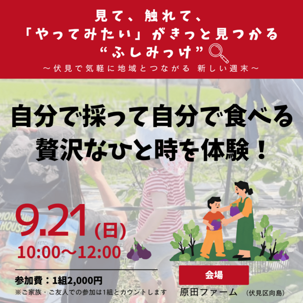 第一弾は伏見区向島の「原田ファーム」さんにご協力いただき、旬のなすの収穫&調理体験を開催します!
