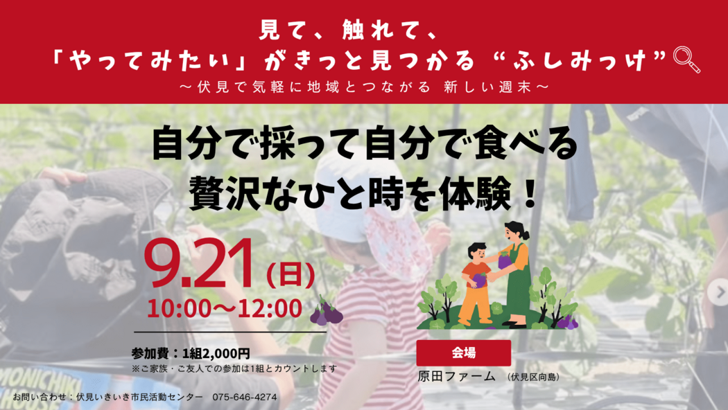 『地域に関わってみたいけど、何から始めればいいんだろう?』そんな風に感じていませんか?「ふしみっけ」は、伏見地域で活動する熱意ある皆さんの取組を、気軽に半日・1日で体験出来るプロジェクトです。少し覗いてみる・一緒に体験するところから始めましょう♪「興味はあるけど、ひとりで参加するのは不安」という方も大歓迎! 初めてでも気軽に参加でき、事前交流会では参加者同士の交流も楽しめます。出会う人や取組を通して、新しい発見がきっとあるはず!ご参加お待ちしています!