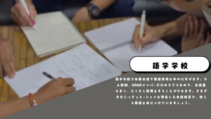 語学学校では英会話や英語表現を中心に学びます。少人数制、HĀWĀメンバーだけのクラスなので、会話量も多く、たくさん質問をすることができます。さまざまなシュチュエーションを想定した会話練習で、使える英語を身につけていきましょう。