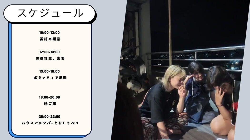 午前中に英語の勉強、午後にボランティア活動というのが平日の流れです。夜にはHĀWĀハウスに戻り、メンバーとの時間を楽しみます。土日や祝日はお寺に出かけてみたり、メンバーと遊びに行ってみたり、あるいはネパールの国内旅行をしてみたり、自分なりの過ごし方をすることができます。