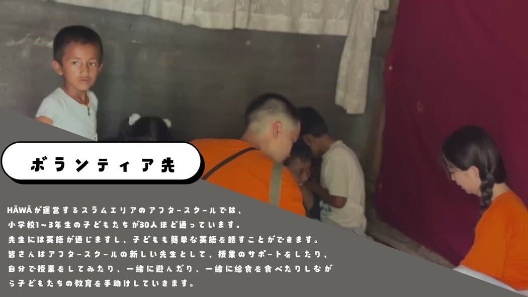 HĀWĀが運営するスラムエリアのアフタースクールでは、小学校1〜3年生の子どもたちが30人ほど通っています。先生には英語が通じますし、子どもも簡単な英語を話すことができます。皆さんはアフタースクールの新しい先生として、授業のサポートをしたり、自分で授業をしてみたり、一緒に遊んだり、一緒に給食を食べたりしながら子どもたちの教育を手助けしていきます。