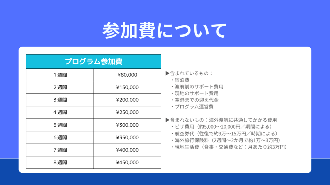 ・サポート費用、宿泊費、空港までの迎え代金込み(現地滞在費は参加費に含まれています) |