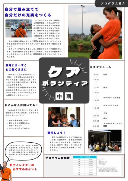 HĀWĀのケアボランティアは、シーズン期間中の自由な期間でスラムのアフタースクールでのボランティアに参加できる海外ボランティアプログラムです。アフタースクールでのボランティアをしながら、自由な時間を使って自分に合わせた生活を送ることができます。