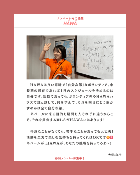 HĀWĀは、ネパールと日本を拠点に、教育・福祉・働き方の現場で"風通しのよさ"を追求する国際協力団体です。スラムの放課後教室や海外ボランティアプログラム、国内での若者支援や企業研修など、枠にとらわれない形で「生きづらさ」に向き合い、誰もが健やかに生きられる社会づくりを目指しています。