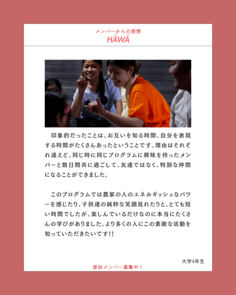 そんな疑問から始まったHĀWĀという考えるプロジェクトにあなたも参加しませんか。私たちが目指す「あるべき社会」の姿を模索し、目指し、試行錯誤する仲間として現地があるのです。HĀWĀと一緒に考えましょう。