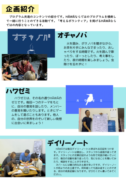 午前中は自由な時間、午後にボランティア活動というのが平日の流れです。夜にはHĀWĀハウスに戻り、メンバーとの時間を楽しみます。土日や祝日はお寺に出かけてみたり、メンバーと遊びに行ってみたり、あるいはネパールの国内旅行をしてみたり、自分なりの過ごし方をすることができます。