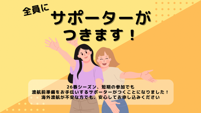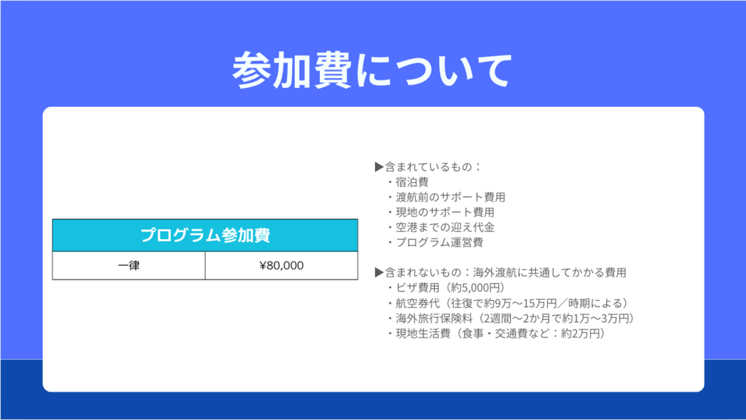 ・サポート費用、宿泊費、空港までの迎え代金込み(現地滞在費は参加費に含まれています) |