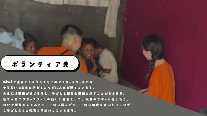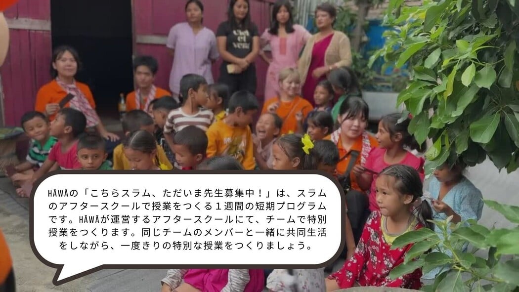 HĀWĀの「こちらスラム、ただいま先生募集中!」は、スラムのアフタースクールで授業をつくる1週間の短期プログラムです。HĀWĀが運営するアフタースクールにて、チームで特別授業をつくります。同じチームのメンバーと一緒に共同生活をしながら、一度きりの特別な授業をつくりましょう!