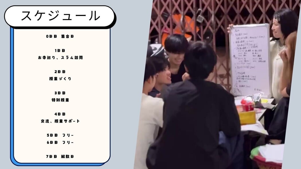 最初にスラムエリアを訪問し、翌日に丸一日かけてミーティングを行い、授業づくりをします。買い出しに行ったり、資料を作ったりしながら準備を進めます。何度もリハーサルをして、いざ授業に向かいます!アフタースクールの子ども達に向けて楽しい授業を行います。
