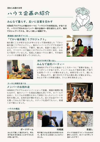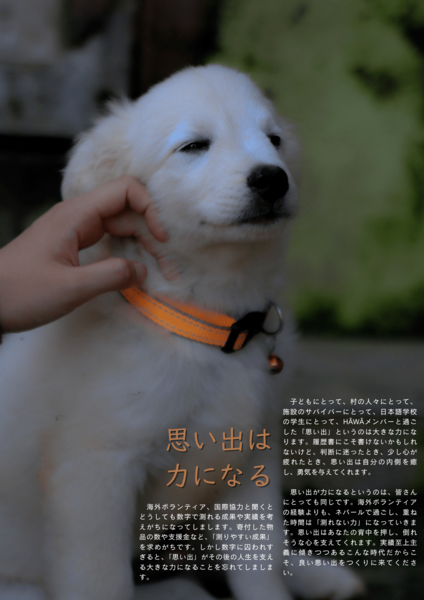 私たちはここに同情にしに来たんじゃない途上国と呼ばれる国で活動していても、私たちは「弱者を救済する」ために活動しているわけではありません。「豊かさとはなにか?」そんな疑問から始まったHĀWĀという考えるプロジェクトにあなたも参加しませんか。私たちが目指す「あるべき社会」の姿を模索し、目指し、試行錯誤する仲間として現地があるのです。HĀWĀと一緒に考えましょう。「弱さを眺めに来たんじゃない。強さに学びに来たんだ。」概要