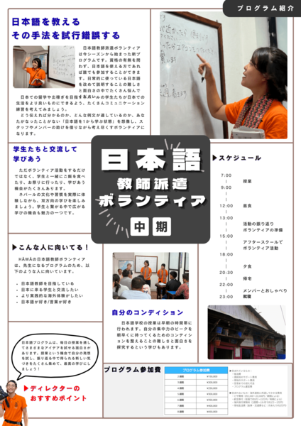 日本語教育は、言葉を教えるだけでなく、文化や思いを分かち合うことができる場でもあります。このプログラムは一人でも多くの学習者と共に成長しながら、言葉を通して豊かなつながりを築いていける、そんな素敵な経験になると思います。