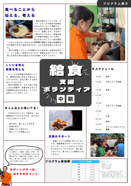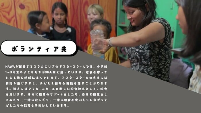 HĀWĀが運営するスラムエリアのアフタースクールでは、小学校1〜3年生の子どもたちが30人ほど通っています。給食を作っているも同じ地域に住んでいます。アフタースクールの先生には英語が通じますし、子どもも簡単な英語を話すことができます。皆さんはアフタースクールの新しい給食担当として、給食を届けます。さらに授業のサポートをしたり、自分で授業をしてみたり、一緒に遊んだり、一緒に給食を食べたりしながら子どもたちの教育を手助けしていきます。