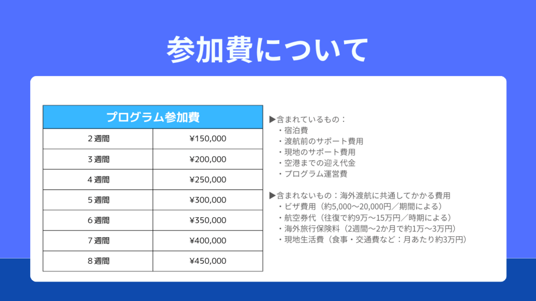 ・サポート費用、宿泊費、空港までの迎え代金込み(現地滞在費は参加費に含まれています) |