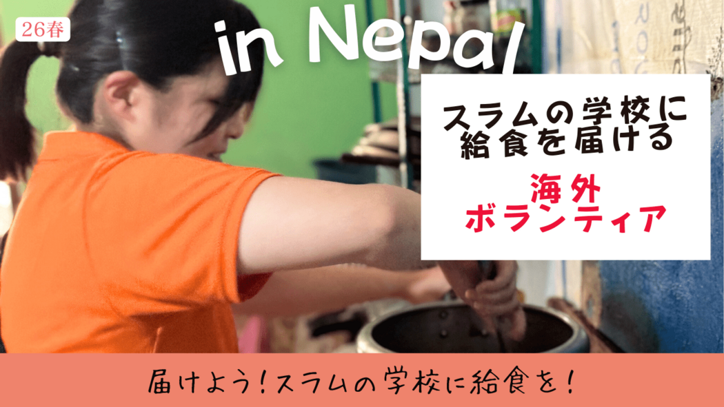 ネパールのスラムのアフタースクールに通う子ども達に毎日の給食を届けるために調理と食育の活動をする海外ボランティアプログラムです。勉強のためのエネルギーとして、食を通じた学習の機会として給食を届けよう!