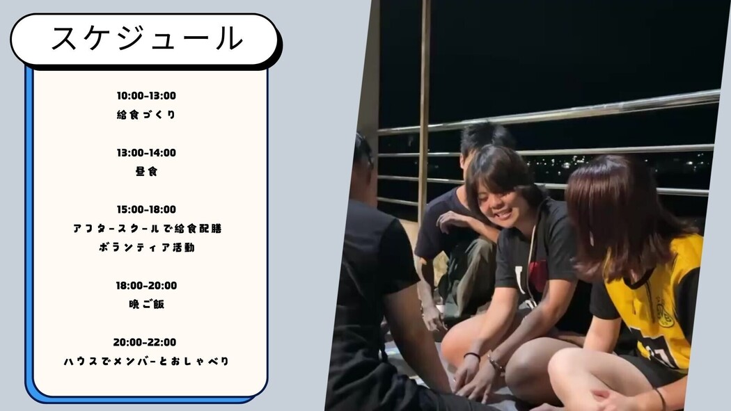 ボランティアに参加するメンバーの動機は千差万別で、「友達をつくりにきた」「不甲斐ない自分を変えにきた」「世界を広げにきた」「子どもに会いにきた」などです。