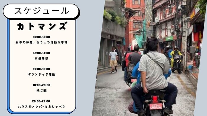 午前中はお寺やカフェなどを巡り、午後にアフタースクールに向かいます。空き時間、休日はバイクタクシーで移動しながら、自分なりに都市での生活を組み立てます。夜にはHĀWĀハウスに戻り、メンバーとの時間を楽しみます。土日や祝日はお寺に出かけてみたり、メンバーと遊びに行ってみたり、自分なりの過ごし方をすることができます。