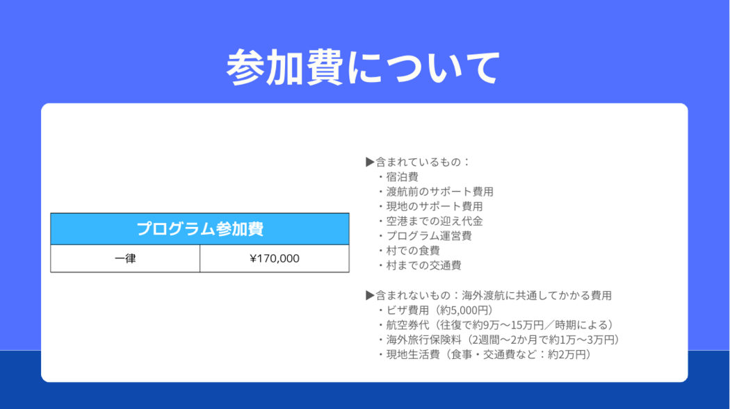 ・サポート費用、宿泊費、空港までの迎え代金、村までの移動費、村での食費込み |