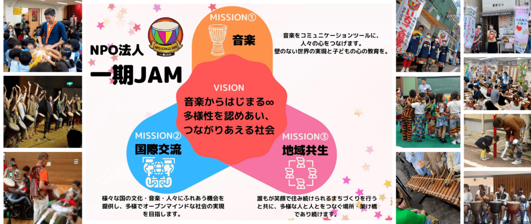 NPO法人一期JAMは、西アフリカの太鼓ジャンベを核に、音楽と食で地域と世界をつなぐ2013年12月設立の団体です。子ども食堂や寺子屋、学校訪問ワークショップ、古着リユース店を運営し、貧困解消(SDG1)と質の高い学び(SDG4)を推進。年間100回超の音楽体験とギニアの子どもへの楽器教育・食支援を実施。地域連携で包摂的な街づくり(SDG11)を進め、循環型消費(SDG12)を実践し、自治体・企業・町会と協働するパートナーシップ(SDG17)で、誰もが笑顔で響き合う社会を目指します。