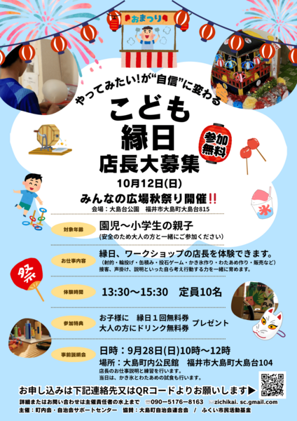 地域活動活性化をするために、年齢や住まいに関係なく楽しみを共有できる居場所「みんなの広場」を月1回以上実施。10月12日(日)に行う秋祭りの手作り縁日運営スタッフを募集しています。