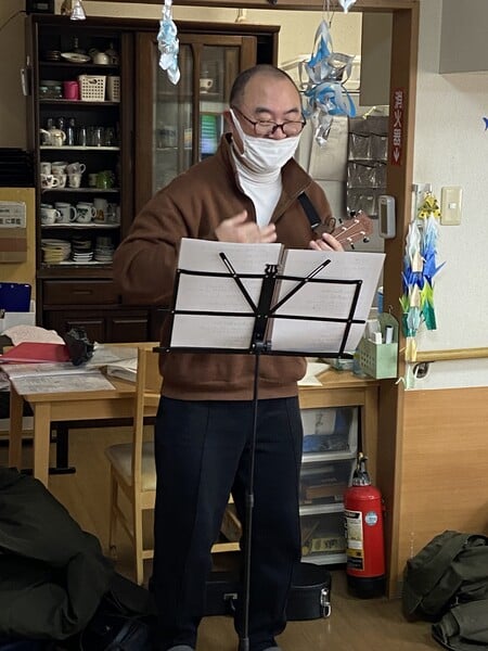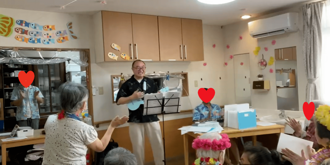 自分は月4~6回程、東京都大田区や神奈川県横浜市、川崎市でウクレレ弾き語りのボランティアをしています、小川隆と言います59歳のおっさんです。普段は『せせらぎ鍼灸マッサージ治療院』院長として高齢者施設を回って訪問マッサージの仕事をしているのですが、仕事を通じて気づいたのは施設の中での人間関係が課題で多くの問題を抱える施設が多い事。
