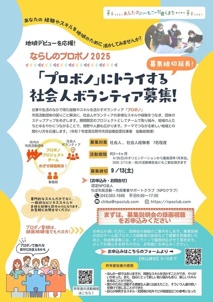 - 【9/13締切】「ならしのプロボノ2025」社会人ボランティア募集