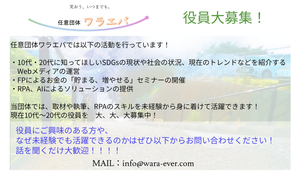 Webメディア運営や道路清掃活動、中高生向けの講演会、RPAにより社会をもっと便利にする活動など多岐にわたって活動を行っている「任意団体ワラエバ」。今回は完全未経験から参加できる運営メンバーを大募集!