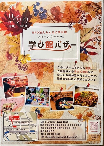 秋まつり当日11月29日(土)は、午前9時頃から午後6時ごろまでを予定しております。その中で、ご都合の良い時間帯だけでも大丈夫です。活動の前に事前説明会を11月28日(金)18:00~イベント会場となる、ふくふくプラザ5階調理室にて行います。この日の参加が難しい方は、11月22日(土)に、みんなの学び館(早良区城西2丁目2-59)にて(時間未定)行いますので、お申し込みフォームにて、その旨をお伝えください。 |