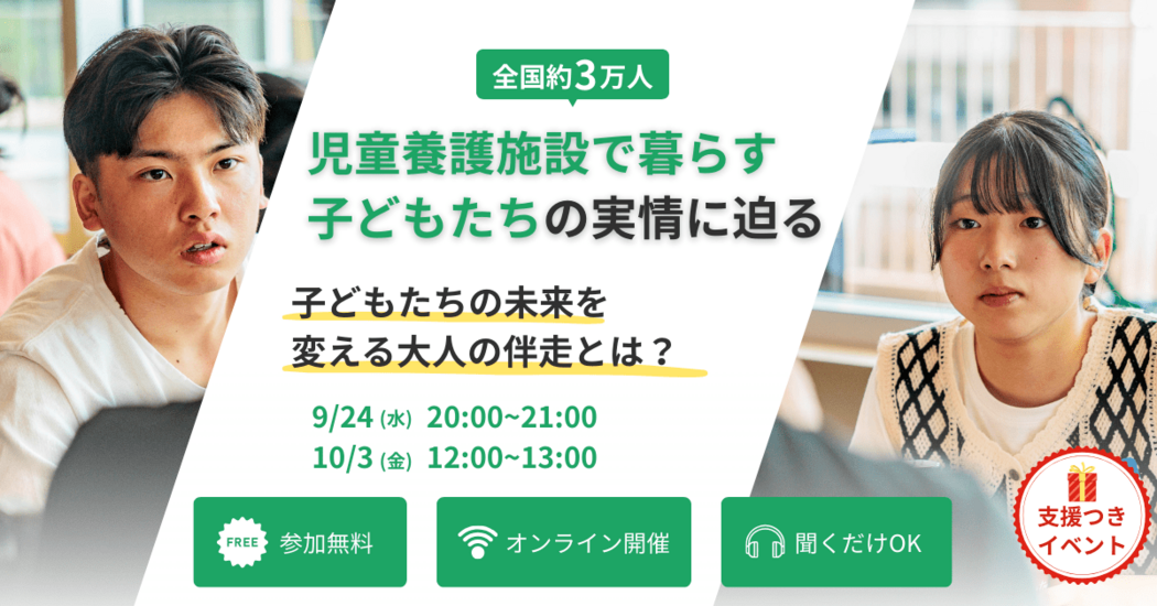 9/24・10/3開催。虐待や貧困で家を離れた子どもたちの今と、児童養護施設のリアルを知るイベントです!