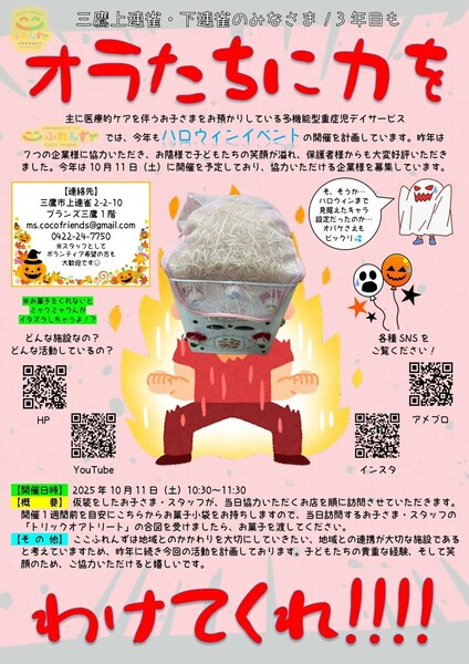 多機能型重症児デイサービス「ここふれんず」が毎年行っている、地域交流も兼ねたボランティアイベント。近隣の小売店様を子どもと一緒に回り、お菓子を貰いに行くという活動における見守りスタッフを募集しておりま