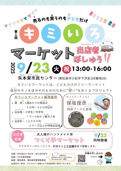 東松島市の矢本東市民センターにおいて、子どもたち(小学生~中学生)が店長として出店するフリーマーケット「キミいろマーケット」を実施します。