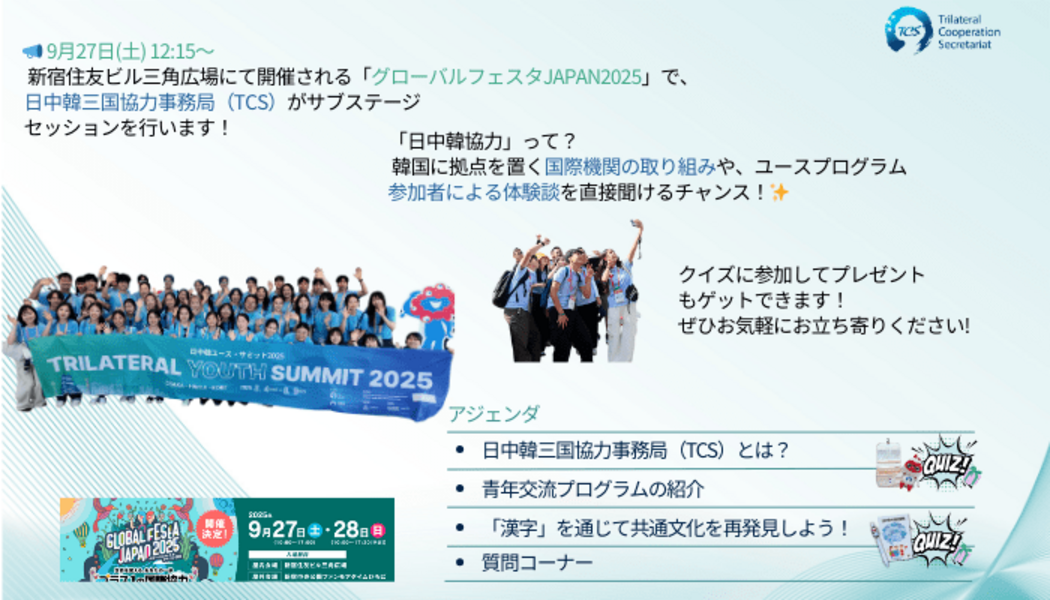「#グローバルフェスタJAPAN2025」@新宿住友ビル三角広場 サブステージにて、日中韓三国協力事務局(#TCS)が登場します!