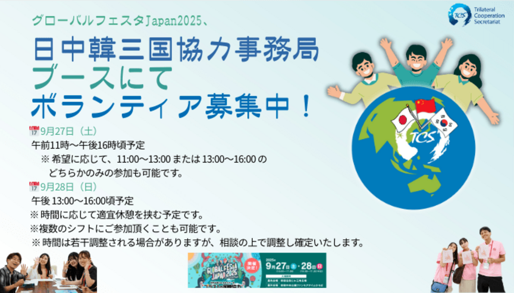 日本・中国・韓国の協力と交流を支える国際機関、日中韓三国協力事務局(TCS)が、9月27日(土)・28日(日)に新宿三角広場で開催されるグローバルフェスタに出展します。ブース運営を一緒にお手伝いしてくださるボランティアを募集しています。