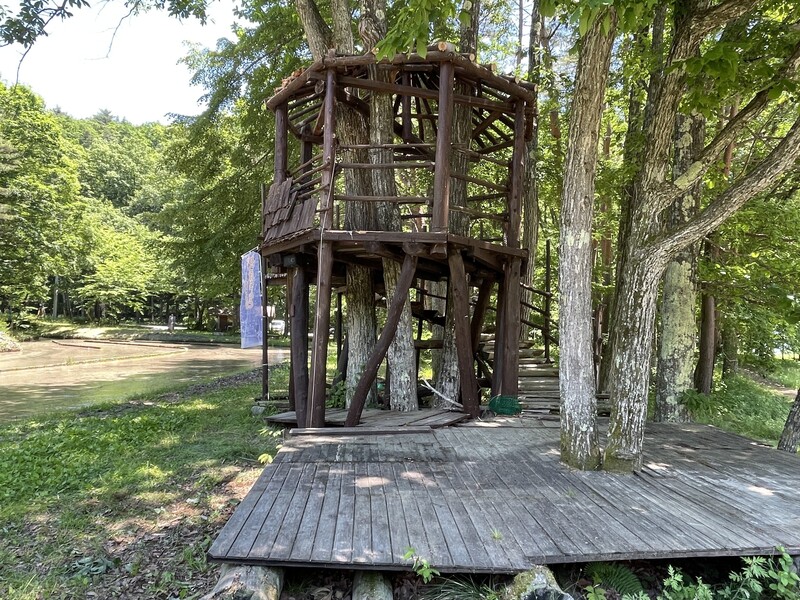 水辺の公園わっぱらんど。市民がボランティアで整備しています。今回はツリーハウスのデッキを修繕。昨秋の北アルプス国際芸術祭で北アルプス林研グループの作品「森アート」の杉材を使ってデッキを張り替えます。